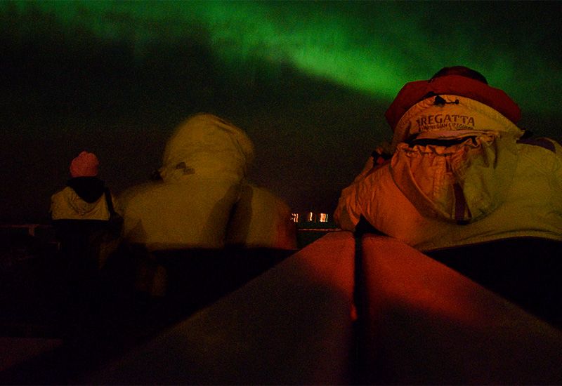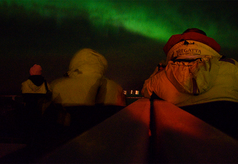 Våra båtar är rymliga och har ett uppvärmt inomhusområde med en bar där du kan köpa förfriskningar. På däck finns det gott om plats för alla som vill stå ute och låta sig förtrollas av det vackra norrskenet. Vi erbjuder varma overaller som håller dig varm under en kall vinterkväll.