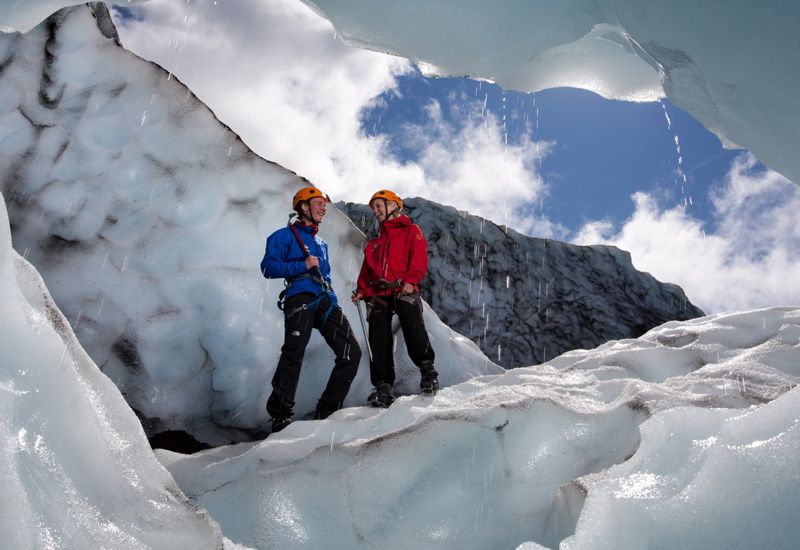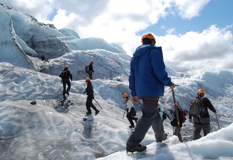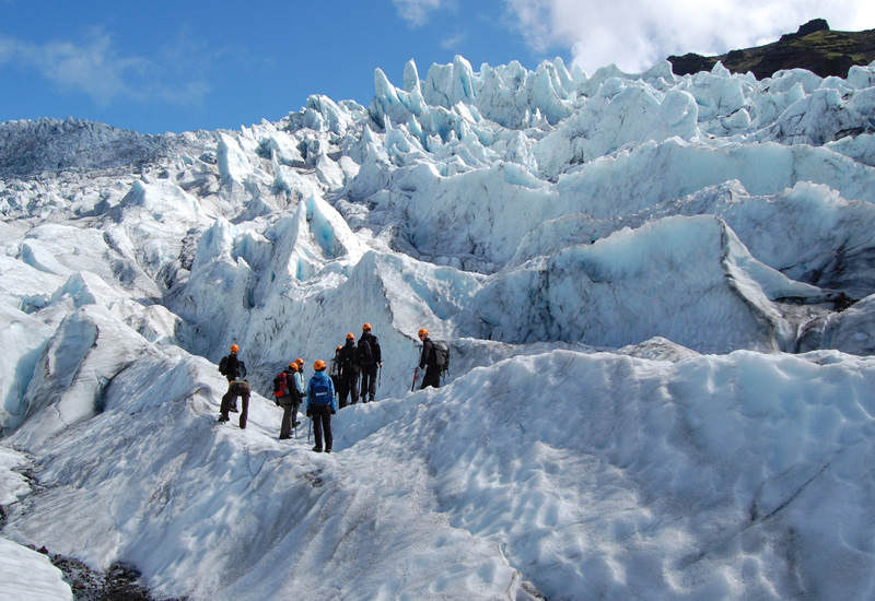 I Skaftafell börjar vi med en introduktion till den unika och fascinerande isvärlden (Glaciala Underverk). Vi går igenom de spektakulära men lättframkomliga stigarna vid Falljökull. Under en kort promenad genom glaciärdalen berättar guiden om de unika egenskaperna hos Falljökull och Virkisjökull samt det omgivande landskapet. När vi når kanten av Falljökull sätter vi på oss glaciärutrustningen och tar oss upp för de isiga men lättillgängliga sluttningarna. På vägen upp upplever vi otroliga isformationer och sprickor. Du får lära dig hur glaciären formas och hur den ständigt förändras. Vi närmar oss det imponerande isfallet – se hur den urgamla isen faller hundratals meter från bergstoppen och långsamt rör sig mot havet, en resa den aldrig hinner slutföra på grund av den globala uppvärmningen som påskyndar dess smältning och tillbakadragande.