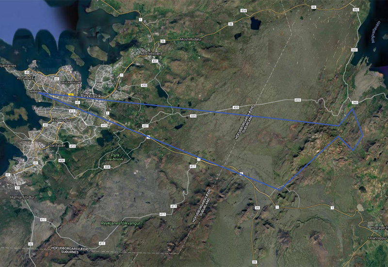 När vi flyger över ett av de mest aktiva vulkaniska områdena på Island, Hellisheiði-platån, kommer du att kunna se mosstäckta lavaslätter som sträcker sig ut mot horisonten och bryts av färgrika basaltberg, ångande varma källor och de geotermiska kraftverken som förser Reykjavik med förnybar energi.