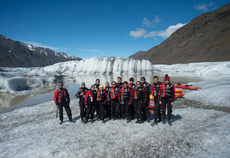 Glaciärkajak är det ultimata sättet att uppleva den världsberömda Vatnajökull nationalpark. Följ med på denna oförglömliga resa och njut av den enastående panoramautsikten över de omgivande bergen och glaciärerna, speglade i Heinabergslóns stilla vatten. Från lagunen får du en fantastisk vy över Vatnajökull-glaciären, och under turen gör vi en kort vandring upp på ett av isbergen för att beundra utsikten över lagunen och det omgivande landskapet från glaciären. Denna promenad sker självklart med all nödvändig glaciärutrustning. Heinabergslón är perfekt för dig som vill uppleva naturen på ett miljövänligt och stillsamt sätt, utan störningar.