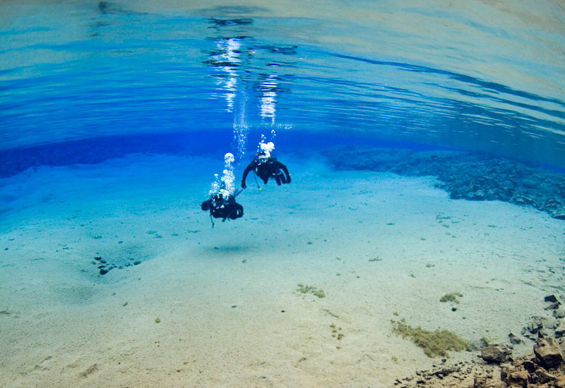 Upplev känslan av att sväva viktlöst genom det kristallklara glacialvattnet på vår tur Silfra dykning – Deep into the Blue. Den långsamma strömmen ger ett perfekt tempo för att utforska detta vackra område. Sikten i det klara färskvattnet är oöverträffad, eftersom det endast är vattnets densitet som begränsar den. Djupet varierar mellan 10 och 40 meter. Vårt maxdjup är begränsat till 18 meter, enligt parkens regler.