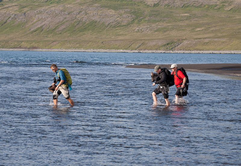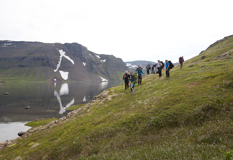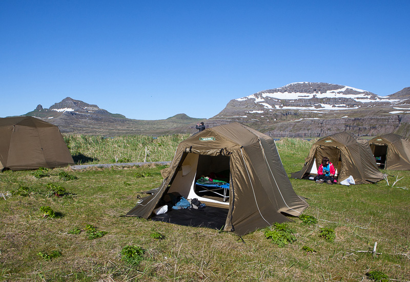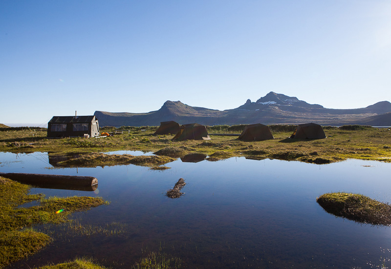 Vi möts vid Aðalstræti (i centrala Ísafjörður) kl. 08:00. Här går vi igenom dagens plan och svarar på alla frågor om turen. Därefter avgår vi med färjan Bjarnarnes från hamnen i Ísafjörður. Vi stiger av vid Veiðileysufjörður, där vi börjar vår vandring. Vi går upp till 500 meters höjd till vår basecamp, där vi sover i tält (liggunderlag och sovsäckar finns på plats). Till middag grillar vi isländsk lammstek och njuter av kvällen tillsammans.