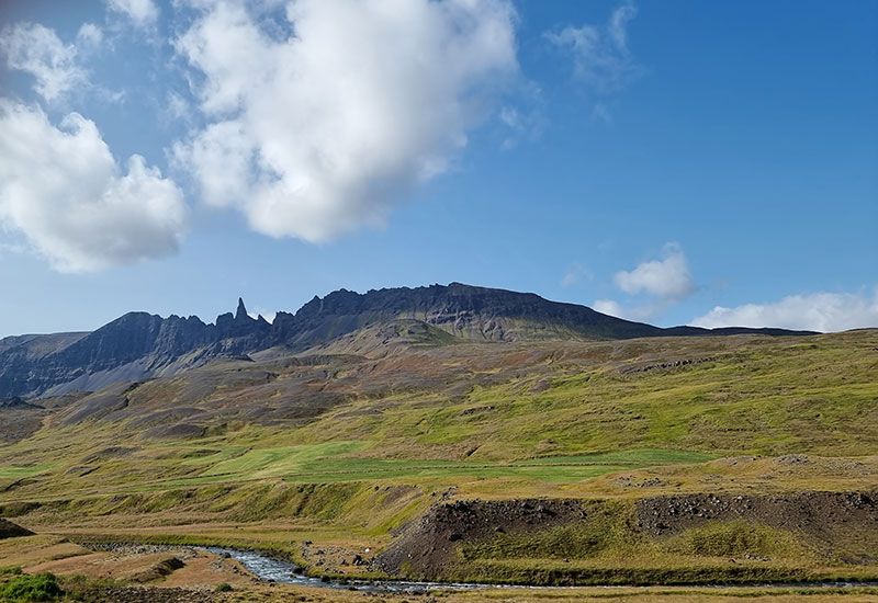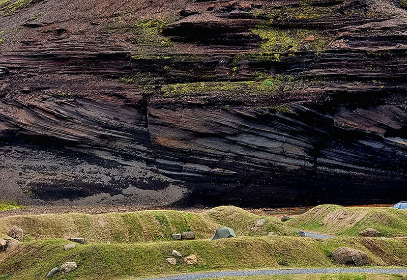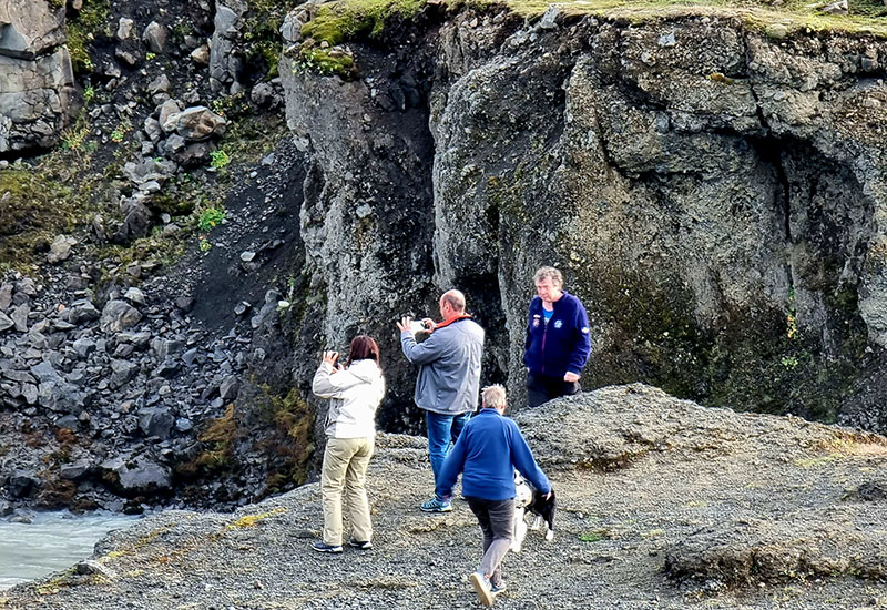 Vi tar en paus vid Highland Base i Ásgarðsdalur – precis vid foten av bergen – där det finns tid att sträcka på benen.