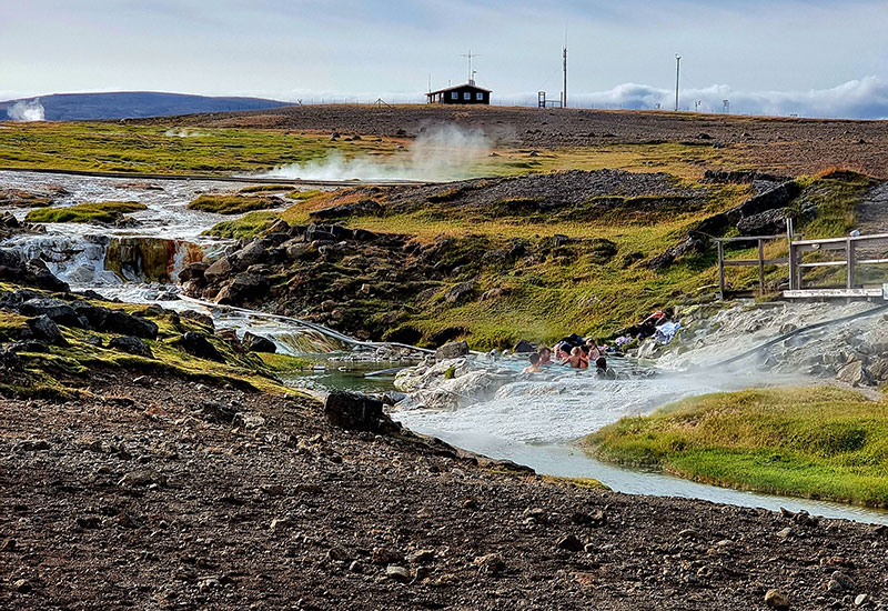Resan fortsätter sedan till Hveradalir, vilket betyder “Dalen med de varma källorna”. Det är en av Islands största geotermiska dalar och ett verkligt naturunder. Vissa av källorna passar perfekt för ett varmt bad ute i naturen, medan andra är så kraftfulla att de bara bör beundras på håll. Området är omgivet av karakteristiska ryolitberg, som ger landskapet dess unika färger och former.